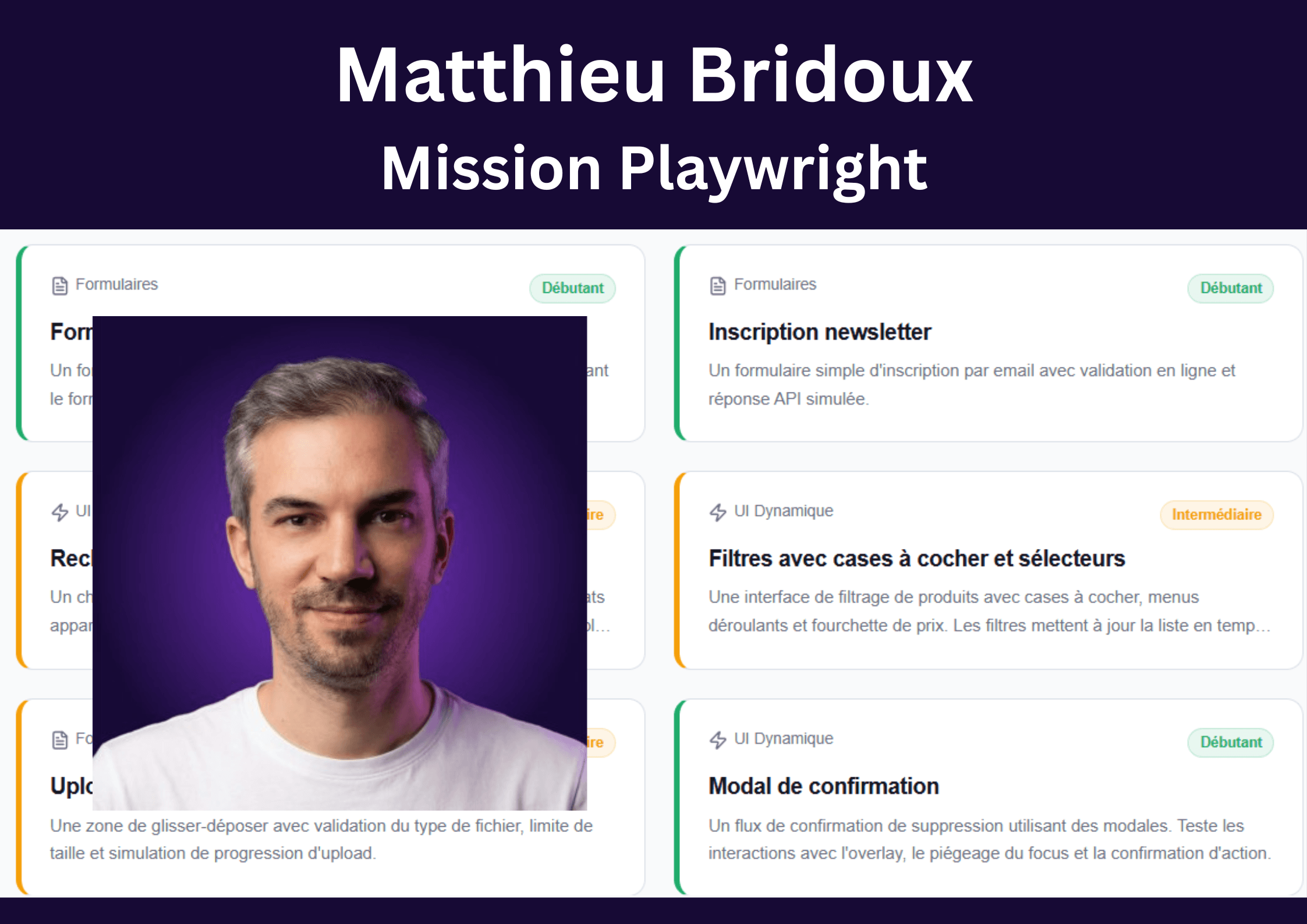 Matthieu Bridoux, dans le test depuis plus d’une décennie, combine une activité de testeur et une activité de formateur. Dans ce cadre, il a développé une plateforme d’entraînement à Playwright : Mission Playwright, qui propose désormais une large gamme d’exercices pratiques. Une initiative précieuse dans le monde du test francophone ! Matthieu a accepté de répondre à nos questions sur cette plateforme et sur sa pratique du test.