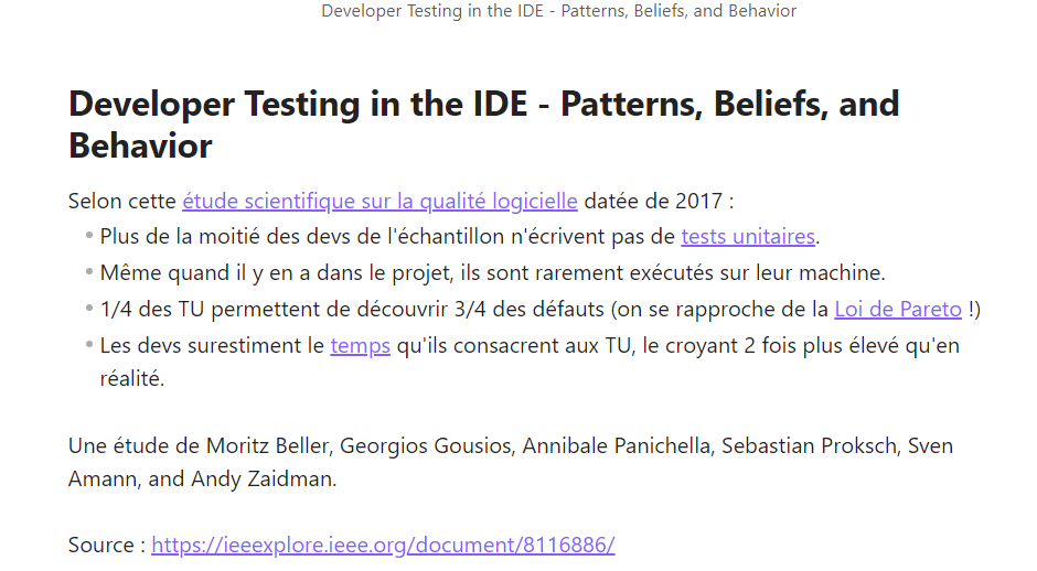 Voici une note Obsidian résumant un article scientifique. Elle comporte plusieurs liens qui permettent de retrouver facilement certaines notions, et permettent aussi en un clic de retrouver tous les autres articles scientifiques sur la qualité logicielle qui ont été enregistrés dans cette instance Obsidian.